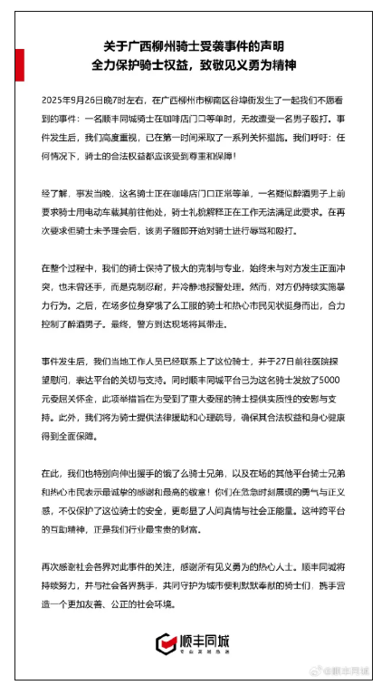 9月27日,顺丰同城也发布了关于广西柳州骑士受袭事件的声明: