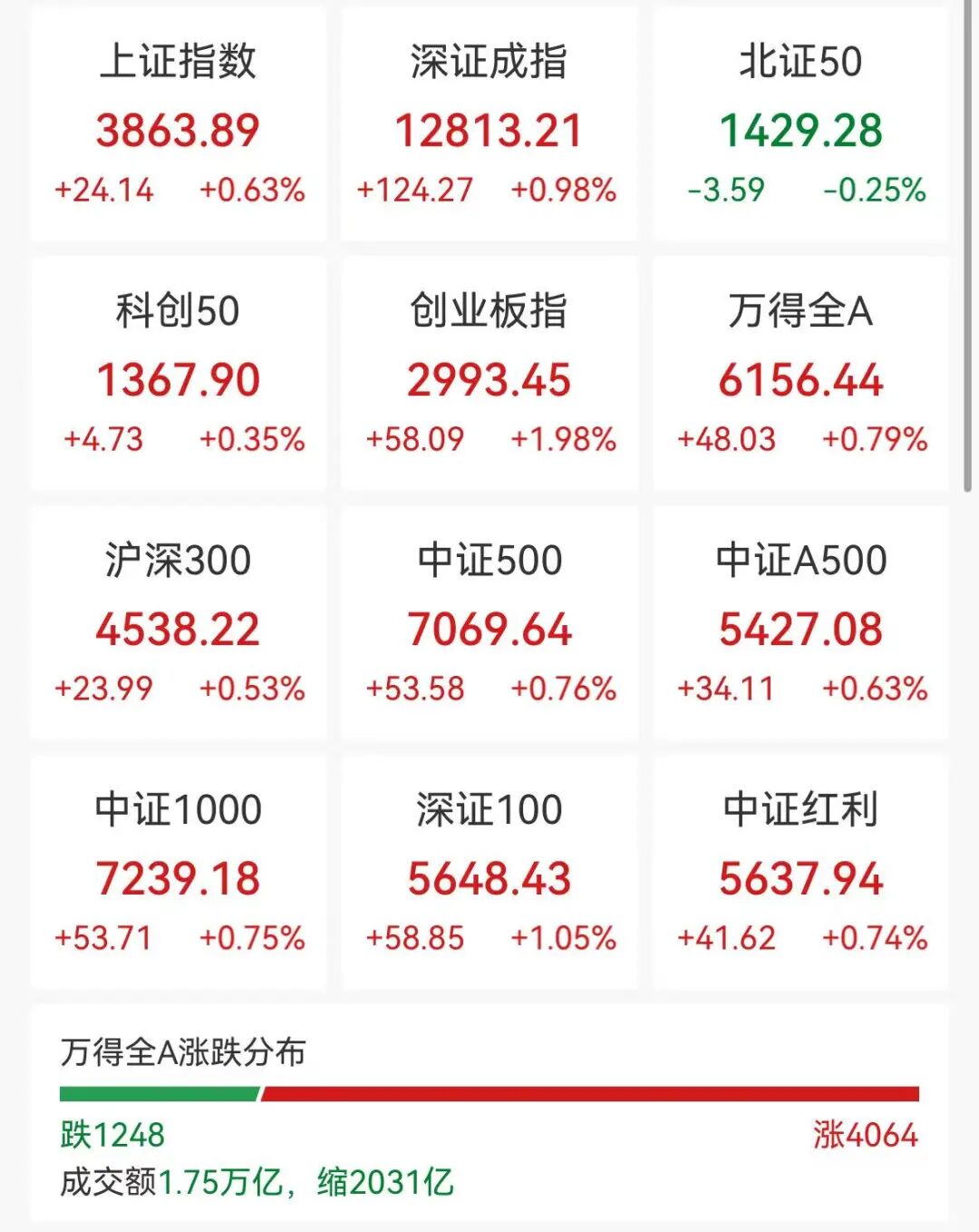 10月20日,A股市场冲高回落,创业板指一度涨超3%。截至收盘,沪指涨0.63%,深成指涨0.98%,创业板指涨1.98%。沪深两市成交1.75万亿,较上一个交易日缩量2031亿,成交额创8月8日以来新低。