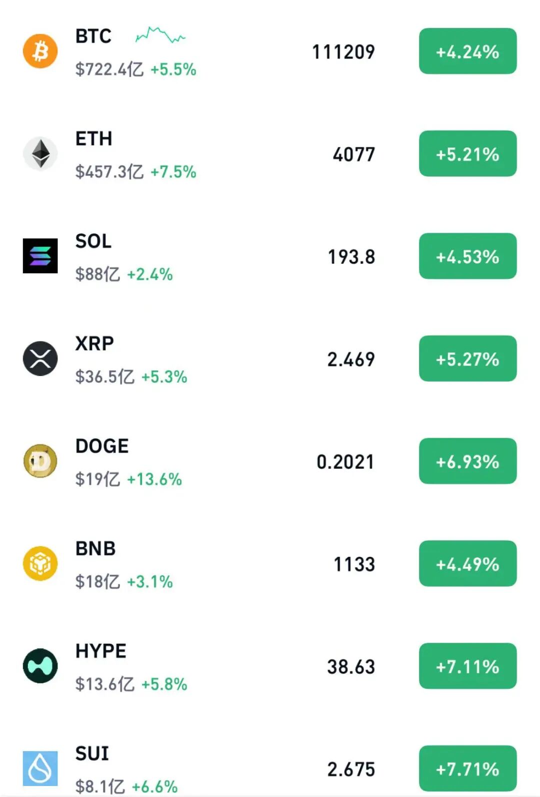 加密货币市场全线大涨,比特币涨至111209美元,过去24小时内涨超4%;以太坊涨至4077美元,过去24小时内涨超5%。