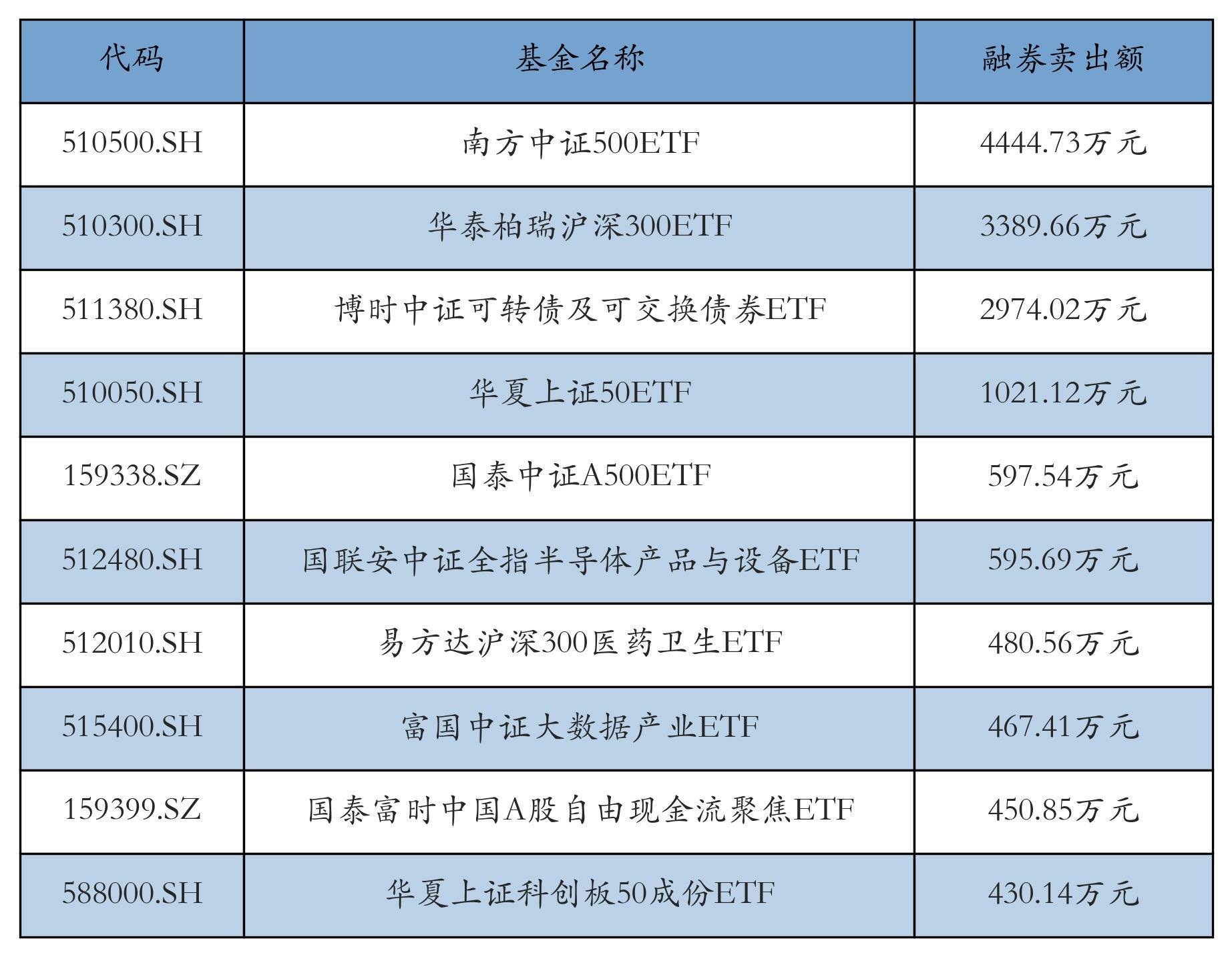 10月24日ETF融券卖出额前三位分别为:南方中证500ETF(4444.73万元)、华泰柏瑞沪深300ETF(3389.66万元)和博时中证可转债及可交换债券ETF(2974.02万元),前10具体见下表: