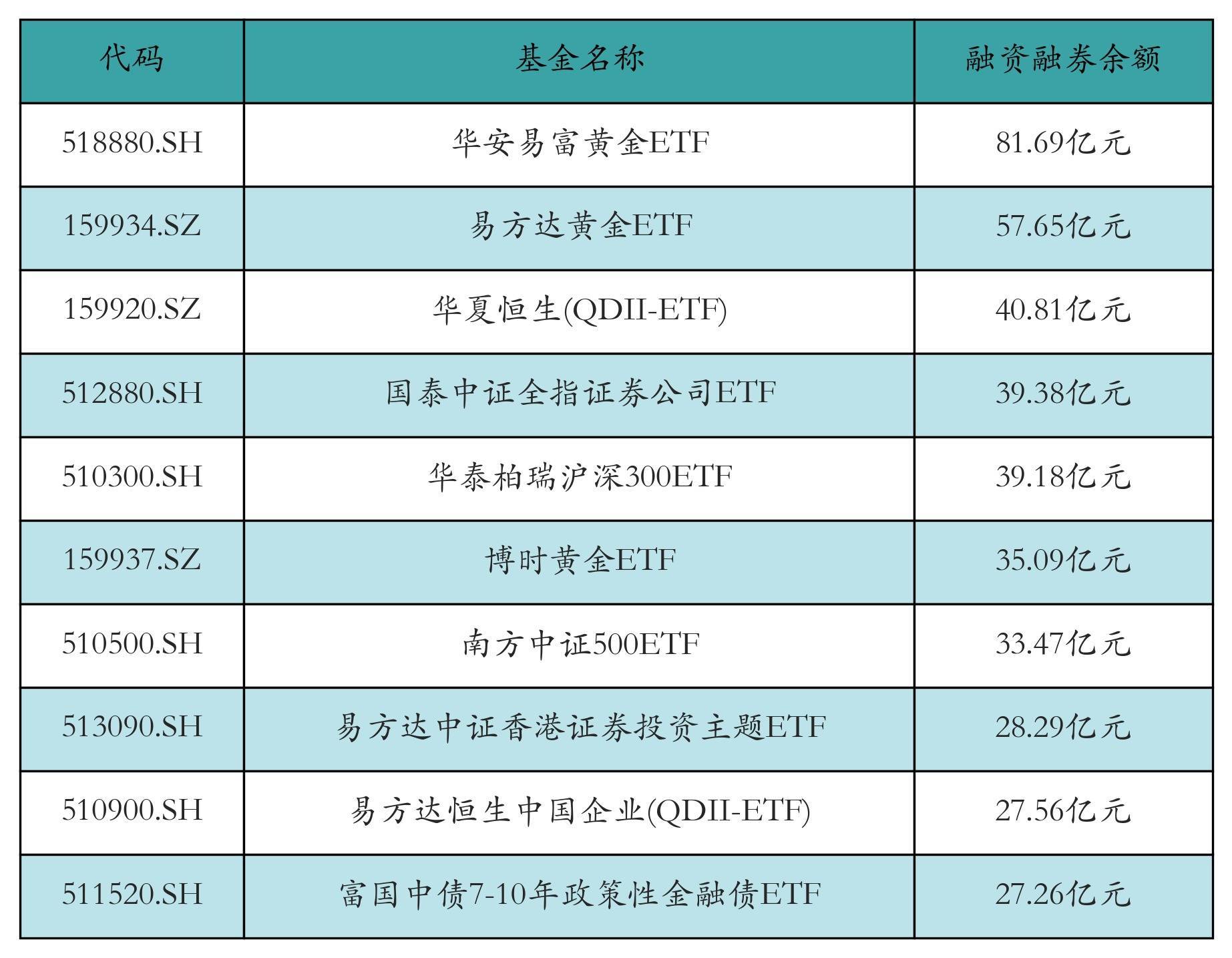 10月24日ETF两融余额前三位分别为:华安易富黄金ETF(81.69亿元)、易方达黄金ETF(57.65亿元)和华夏恒生(QDII-ETF)(40.81亿元)晟红网,前10具体见下表: